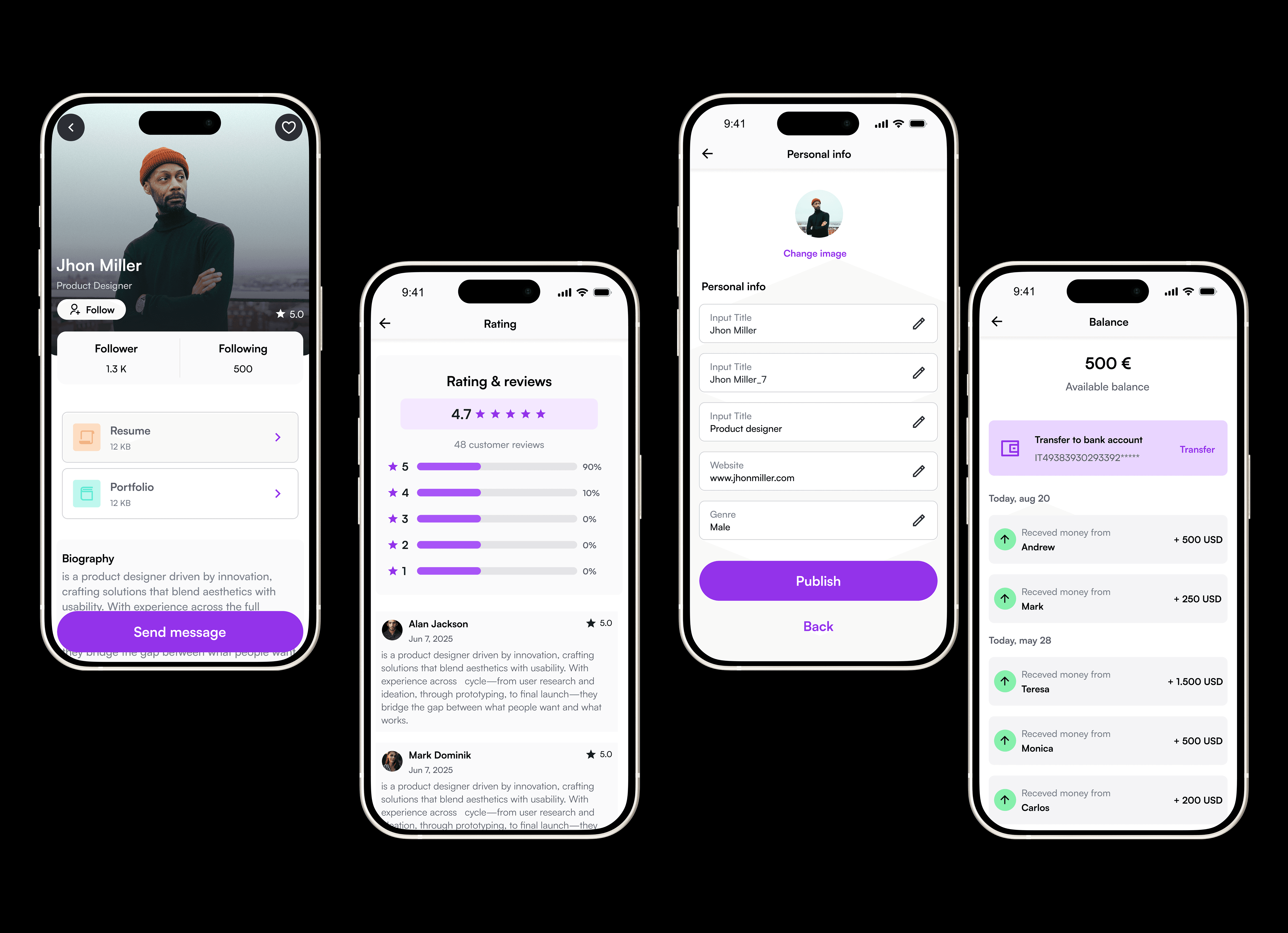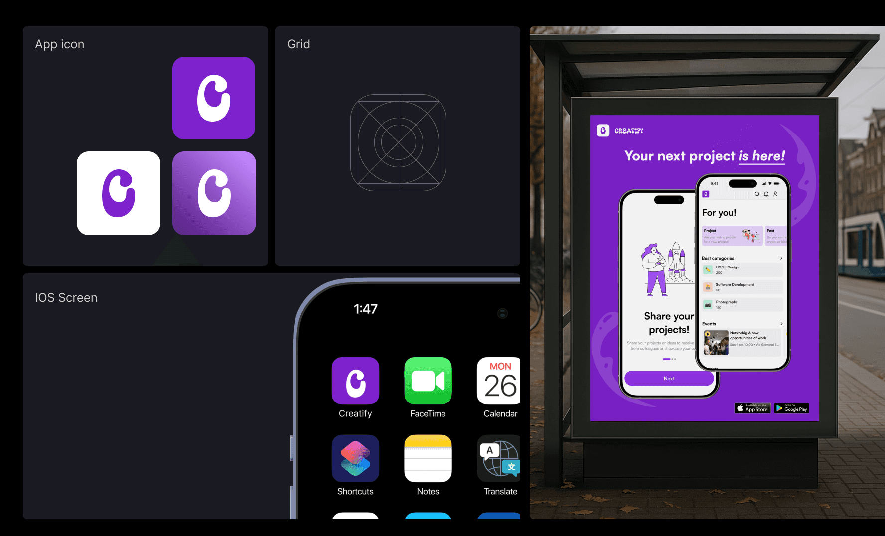 The first step was to conceive the visual identity: not merely a logo or color palette, but a coherent visual language that clearly communicates the app’s mission creating connections between talent and projects. I built a brand image that reflects creativity, accessibility, and professionalism. This included defining typography, color palette, visual tone, main iconography, and image style, so that every screen and every user‑interface component responds to a strong and recognizable identity..