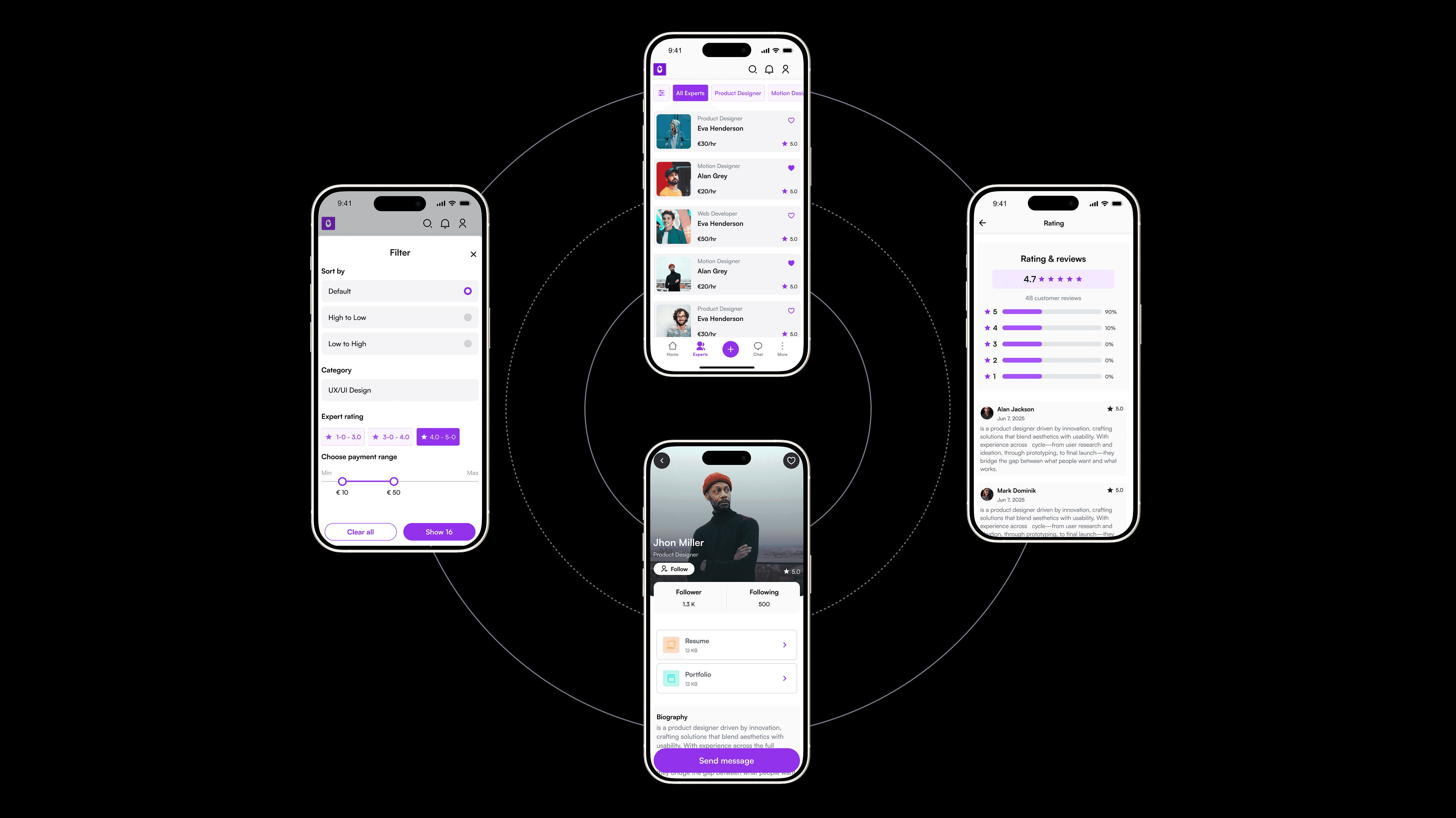 One of the core value propositions of the app is the ability to help users find the perfect specialist for their project in just a few clicks. To realize this promise, I designed a streamlined, intuitive flow: after a brief profile setup or project brief, users can immediately access a curated selection of talent filtered by skillset, availability, and creative discipline. Dynamic filters and an optimized interface minimise search effort, enabling users to identify the right collaborator with ease. This approach not only accelerates the match between creative professionals and projects, but also builds trust by offering clarity, control, and quality from the very first interaction.